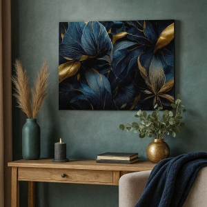 Obraz na płótnie - Eleganckie liście w złotych i granatowych odcieniach - 140x50cm - Złotem podszyte - Nowoczesna dekoracja ścienna do salonu i sypialni ARTTOR
