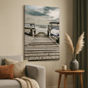 Obraz na płótnie - Drewniany pomost prowadzący na piaszczystą plażę pod zachmurzonym niebem - 50x70cm - Plaża północy - Nowoczesna dekoracja ścienna do salonu, kuchni i sypialni ARTTOR