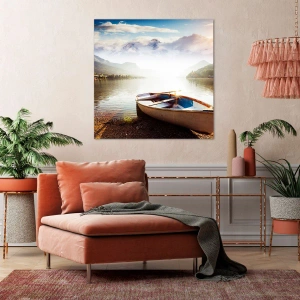 Obraz na ścianę - Nad wodą wielką i czystą - Łódka na brzegu jeziora z widokiem na góry o poranku