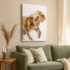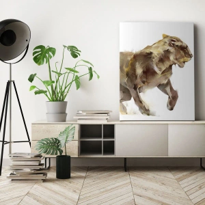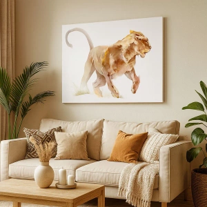 - Artystyczna interpretacja biegnącej lwicy, dynamiczna i subtelna w beżowych tonacjach. Elegancka dekoracja dla miłośników sztuki i dzikiej natury.