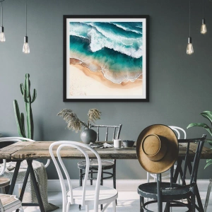 Plakat w czarnej ramie - Widok na plażę i fale morskie w odcieniach turkusu - 70x50cm - Odwieczne spotkanie - Nowoczesna dekoracja ścienna do salonu i sypialni ARTTOR
