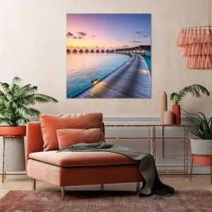 - Romantyczny obraz przedstawiający molo prowadzące do domków na wodzie oświetlonych zachodzącym słońcem. Idealny do wnętrz inspirowanych wakacjami.