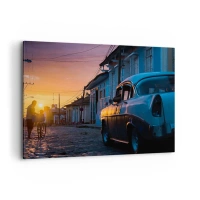 Obraz na płótnie - Retro samochód i rower na ulicy w świetle zachodzącego słońca - 100x70cm - Tutaj zwalnia czas - Nowoczesna dekoracja ścienna do salonu, kuchni i sypialni ARTTOR