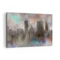 Obraz na płótnie - Artystyczna wizja miejskiego krajobrazu z wieżowcami w pastelowych barwach - 120x80cm - Kompozycja ze stali, kamienia i mgły - Nowoczesna dekoracja ścienna do salonu, kuchni i sypialni ARTTOR