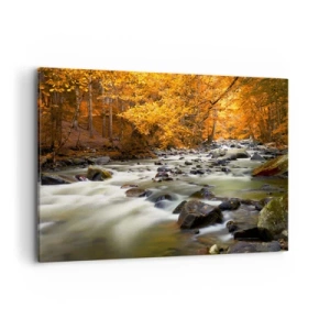 Obraz na płótnie - Strumień w jesiennym lesie otoczony złotymi liśćmi - 120x80cm - Potok w złotym lesie - Nowoczesna dekoracja ścienna do salonu, kuchni i sypialni ARTTOR