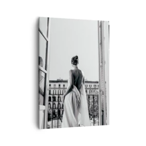 Obraz na płótnie - Kobieta w białej sukni stojąca na balkonie z widokiem na miasto - 50x70cm - Przebudzenie zmysłów - Nowoczesna dekoracja ścienna do salonu, kuchni i sypialni ARTTOR