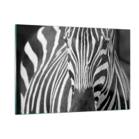 Obraz na szkle - Czarno-biały portret zebry z widocznymi pasami - 120x80cm - Świat jest czarno-biały - Nowoczesna dekoracja ścienna do salonu, kuchni i sypialni ARTTOR
