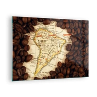 Obraz na szkle - Mapa Ameryki Południowej otoczona ziarnami kawy - 70x50cm - Skąd pochodzi najlepsza kawa? - Nowoczesna dekoracja ścienna do salonu i sypialni ARTTOR