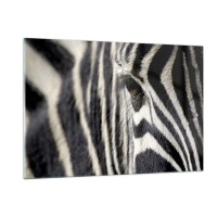 Obraz na szkle - Zbliżenie na oko zebry i czarno-białe paski - 120x80cm - Portret w paski - Nowoczesna dekoracja ścienna do salonu, kuchni i sypialni ARTTOR