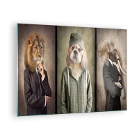 Obraz na szkle - Trzy zwierzęta w eleganckich ubraniach na stylizowanym tle - 70x50cm - Co ja tu robię?! - Nowoczesna dekoracja ścienna do salonu i sypialni ARTTOR