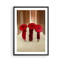 Plakat w czarnej ramie - Mnisi z czerwonymi parasolkami w świątynnych korytarzach - 50x70cm - W drodze do Czystej Krainy - Nowoczesna dekoracja ścienna do salonu i sypialni ARTTOR