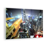 Obraz na szkle - Panorama nocnego miasta z oświetlonymi wieżowcami - 70x50cm - Cud na pustyni - Nowoczesna dekoracja ścienna do salonu i sypialni ARTTOR