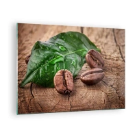 Obraz na szkle - Ziarna kawy na tle liścia i drewna - 70x50cm - Najprawdziwsza i czarna - Nowoczesna dekoracja ścienna do salonu i sypialni ARTTOR