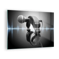 Obraz na szkle - Mikrofon z słuchawkami na tle fal dźwiękowych - 70x50cm - Jeszcze słychać śpiew - Nowoczesna dekoracja ścienna do salonu i sypialni ARTTOR