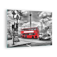 Obraz na szkle - Czerwony autobus na tle czarno-białego miejskiego krajobrazu - 70x50cm - Prawdziwy krwioobieg miasta - Nowoczesna dekoracja ścienna do salonu i sypialni ARTTOR