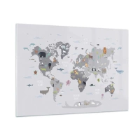 Obraz na szkle - Ilustrowana mapa świata z charakterystycznymi zwierzętami - 100x70cm - Powiedz mi, skąd jesteś… - Nowoczesna dekoracja ścienna do salonu, kuchni i sypialni ARTTOR