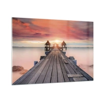 Obraz na szkle - Drewniane molo prowadzące do altanek nad wodą o zachodzie słońca - 100x70cm - Zachód na wschodzie - Nowoczesna dekoracja ścienna do salonu, kuchni i sypialni ARTTOR