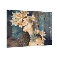 Obraz na szkle - Kobieca postać z liliami w baśniowej stylizacji - 100x70cm - Baśń o królewnie z liliami - Nowoczesna dekoracja ścienna do salonu, kuchni i sypialni ARTTOR