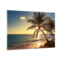 Obraz na szkle - Tropikalna plaża z palmami w świetle zachodzącego słońca - 100x70cm - Lato pod palmami - Nowoczesna dekoracja ścienna do salonu, kuchni i sypialni ARTTOR