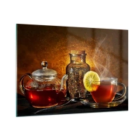 Obraz na szkle - Szklany imbryk i filiżanka herbaty z cytryną - 100x70cm - W stylu holenderskich mistrzów - Nowoczesna dekoracja ścienna do salonu, kuchni i sypialni ARTTOR