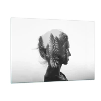 Obraz na szkle - Kobieta w czerni i bieli z nałożonym motywem lasu iglastego - 120x80cm - Pani sosnowego lasu - Nowoczesna dekoracja ścienna do salonu, kuchni i sypialni ARTTOR