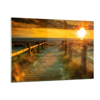 Obraz na szkle - Drewniana ścieżka prowadząca ku zachodzącemu słońcu - 120x80cm - Skąpane w starym złocie - Nowoczesna dekoracja ścienna do salonu, kuchni i sypialni ARTTOR