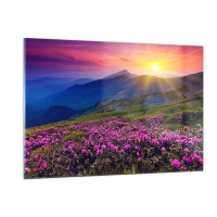 Obraz na szkle - Kwiatowe łąki w górach o wschodzie słońca - 120x80cm - … A dokoła pachnie kosodrzewina i wonieją zioła - Nowoczesna dekoracja ścienna do salonu, kuchni i sypialni ARTTOR