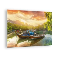 Obraz na szkle - Tradycyjne łodzie w tropikalnym krajobrazie o zachodzie słońca - 70x50cm - Przed pracowitym dniem - Nowoczesna dekoracja ścienna do salonu i sypialni ARTTOR