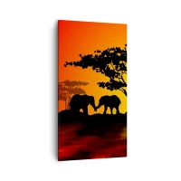 Fototapeta Premium Canvas - Afrykański zachód słońca z sylwetkami słoni i żyrafy nad wodą - 100x70cm - Spotkanie na sawannie - Nowoczesna dekoracja ścienna do salonu i sypialni ARTTOR