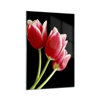 Obraz na szkle - Czerwone tulipany z kroplami rosy na czarnym tle - 70x100cm - Obietnica czystej miłości - Nowoczesna dekoracja ścienna do salonu i sypialni ARTTOR