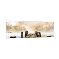Obraz na szkle - Drewniane molo prowadzące na spokojne jezioro w porannej mgle - 160x50cm - Łagodny smutek jesieni - Nowoczesna dekoracja ścienna do salonu i sypialni ARTTOR