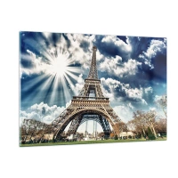 Obraz na szkle - Wieża Eiffla na tle promiennego nieba - 120x80cm - Jedyna taka pod słońcem - Nowoczesna dekoracja ścienna do salonu, kuchni i sypialni ARTTOR