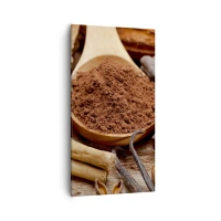Obraz na szkle - Łyżka kakao i składniki czekoladowe w rustykalnej aranżacji - 70x100cm - Najlepsza na smutki - Nowoczesna dekoracja ścienna do salonu i sypialni ARTTOR