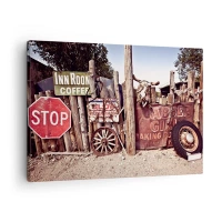Obraz na płótnie - Drewniany płot z retro znakami drogowymi - 50x70cm - A czas się zatrzymał - Nowoczesna dekoracja ścienna do salonu, kuchni i sypialni ARTTOR