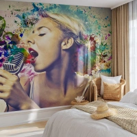 Fototapeta Premium Sand - Kobieta śpiewająca do mikrofonu w otoczeniu kolorowych nut - 100x70cm - Pomalować głosem świat - Nowoczesna dekoracja ścienna do salonu, kuchni i sypialni ARTTOR