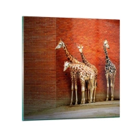 Zegar ścienny - Cztery żyrafy na tle ceglanej ściany w artystycznej scenerii - 30x30cm - Widzicie jakąś akację? - Nowoczesna dekoracja ścienna do salonu i sypialni ARTTOR