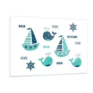 Obraz na szkle - Morski motyw z żaglówkami i wielorybami - 120x80cm - Przez morza i oceany - Nowoczesna dekoracja ścienna do salonu, kuchni i sypialni ARTTOR