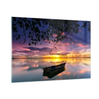 Obraz na płótnie - Łódka na spokojnej wodzie o zachodzie słońca - 100x70cm - "Zdajesz się wisieć w środku niebokręga…" - Nowoczesna dekoracja ścienna do salonu, kuchni i sypialni ARTTOR