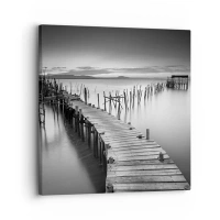 Zegar ścienny - Czarno-biały drewniany pomost prowadzący na spokojne wody - 30x30cm - Spokój zapomnianego brzegu - Nowoczesna dekoracja ścienna do salonu, kuchni i sypialni ARTTOR