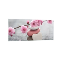 Obraz na szkle - Delikatne kwiaty wiśni z kamieniami w kształcie serca - 120x50cm - Błogość z kwiatem wiśni - Nowoczesna dekoracja ścienna do salonu i sypialni ARTTOR
