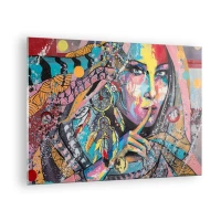 Obraz na szkle - Kolorowy portret kobiety z motywami etnicznymi i piórami - 120x80cm - Milcz, aż zrozumiesz - Nowoczesna dekoracja ścienna do salonu, kuchni i sypialni ARTTOR