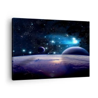 Obraz na płótnie - Kosmiczny pejzaż z planetami i gwiazdami - 50x70cm - Wciąż sami? - Nowoczesna dekoracja ścienna do salonu, kuchni i sypialni ARTTOR
