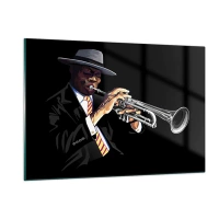 Obraz na szkle - Czarnoskóry muzyk z trąbką w kapeluszu na czarnym tle - 120x80cm - Czar starej szkoły - Nowoczesna dekoracja ścienna do salonu, kuchni i sypialni ARTTOR