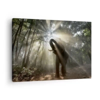Obraz na płótnie - Słoń w lesie otoczony promieniami światła w porannej mgle - 70x50cm - Pod szczęśliwą gwiazdą - Nowoczesna dekoracja ścienna do salonu i sypialni ARTTOR