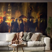 Fototapeta Standard Eco - Mroczna scena deszczowego miasta z postaciami pod parasolami - 100x70cm - Wyznawcy deszczu - Nowoczesna dekoracja ścienna do salonu i sypialni ARTTOR
