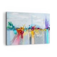 Obraz na płótnie - Abstrakcyjny krajobraz z kolorowymi akcentami - 100x70cm - Most radości nad rzeką życia - Nowoczesna dekoracja ścienna do salonu, kuchni i sypialni ARTTOR