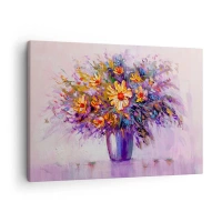 Obraz na płótnie - Bukiet kolorowych kwiatów w fioletowym wazonie w stylu impresjonistycznym - 50x70cm - Słodko pachnie, słodko wygląda - Nowoczesna dekoracja ścienna do salonu, kuchni i sypialni ARTTOR