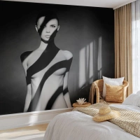 Plakat - Kobieta w czarno-białych graficznych cieniach - 50x70cm - W blasku i w cieniu - Nowoczesna dekoracja ścienna do salonu, kuchni i sypialni ARTTOR