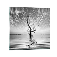 Zegar ścienny - Czarno-biały pejzaż z drzewem na wodzie i gwiezdnymi okręgami - 30x30cm - Symfonia natury - Nowoczesna dekoracja ścienna do salonu, kuchni i sypialni ARTTOR