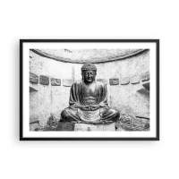 Plakat w czarnej ramie - Czarno-biały posąg Buddy w medytacyjnej pozie - 70x50cm - U źródeł spokoju - Nowoczesna dekoracja ścienna do salonu i sypialni ARTTOR